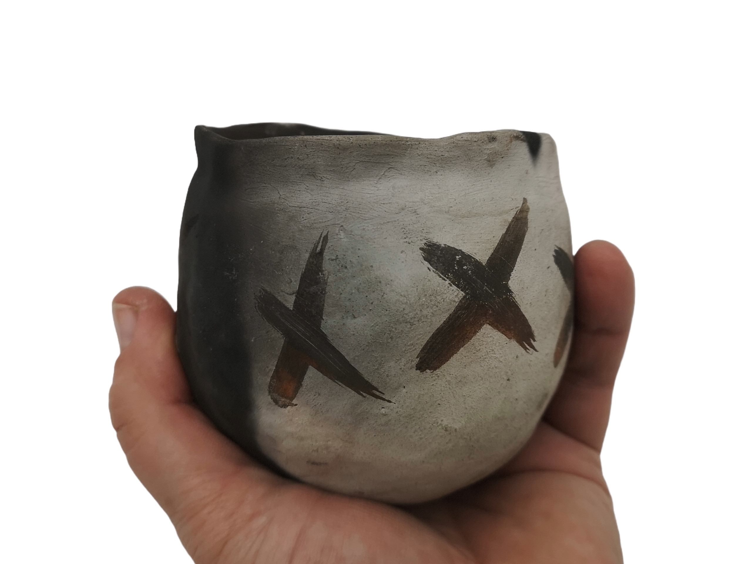 Nieduży kubek wygniatany w jednego kawałka gliny. Klasyczny kugeltopf – kubek z zaokrąglonym dnem, typowy dla rejonu Danii. Wzorowany na znalezisku z Hedeby. Wypalany w ognisku.