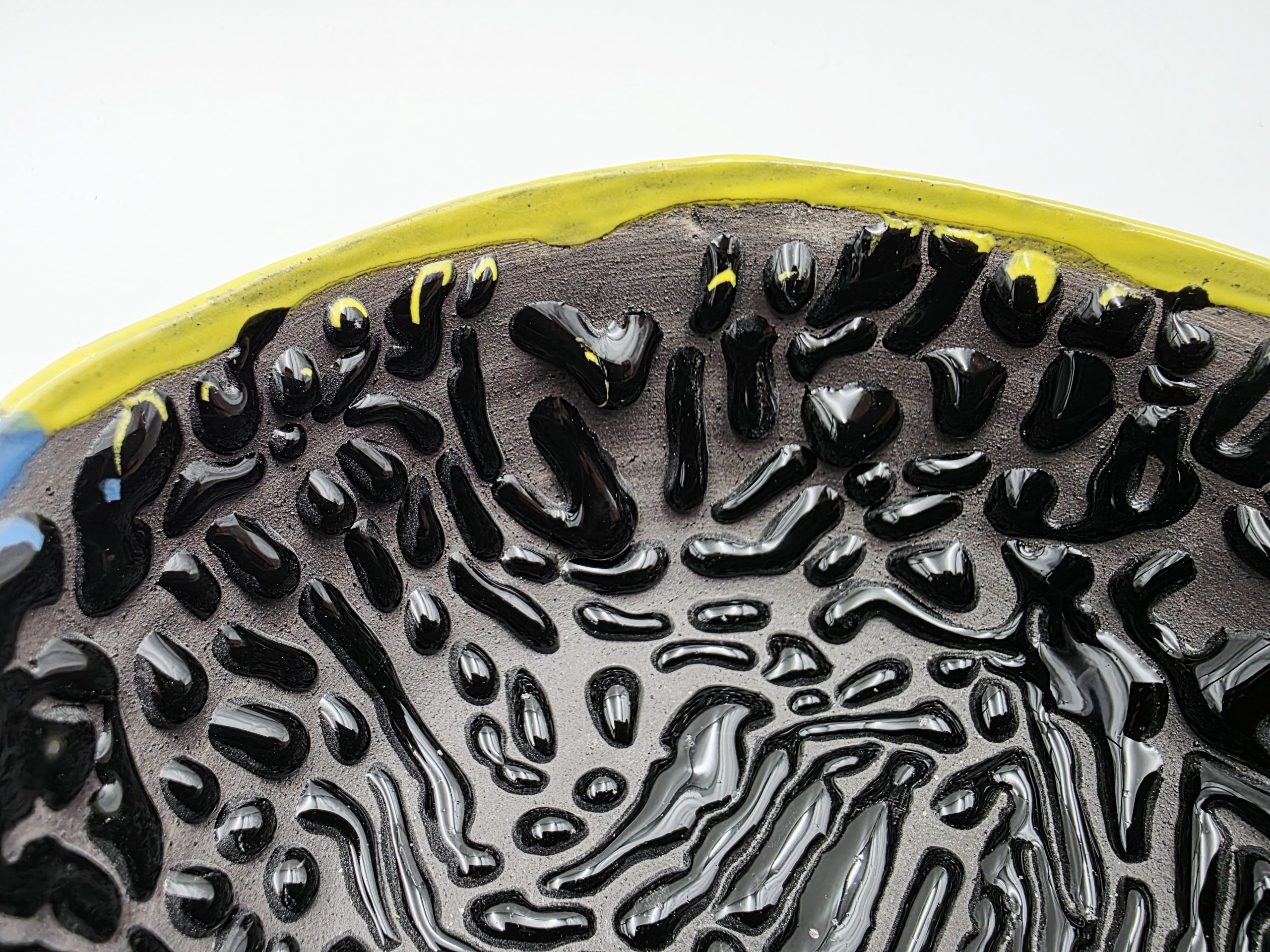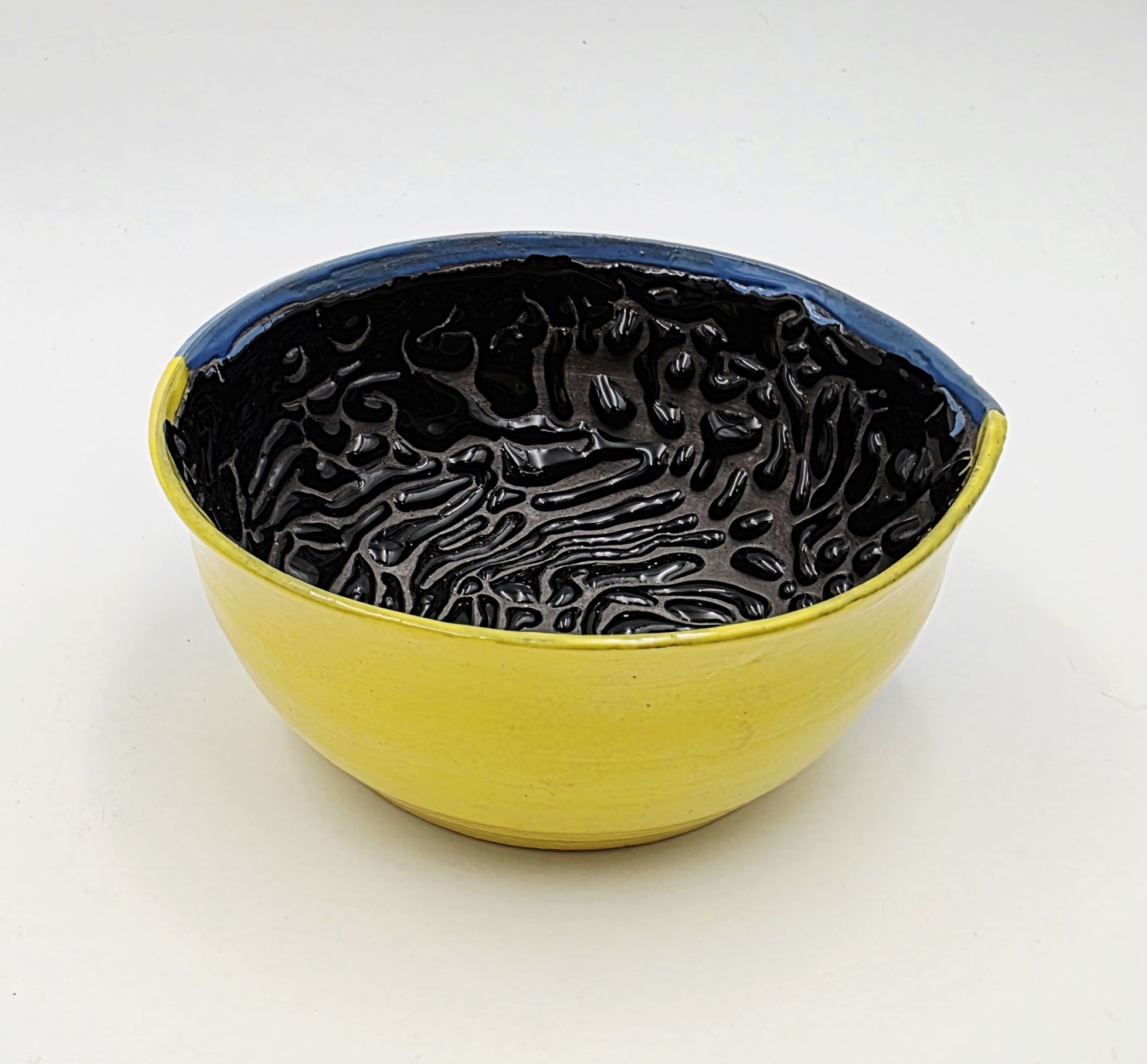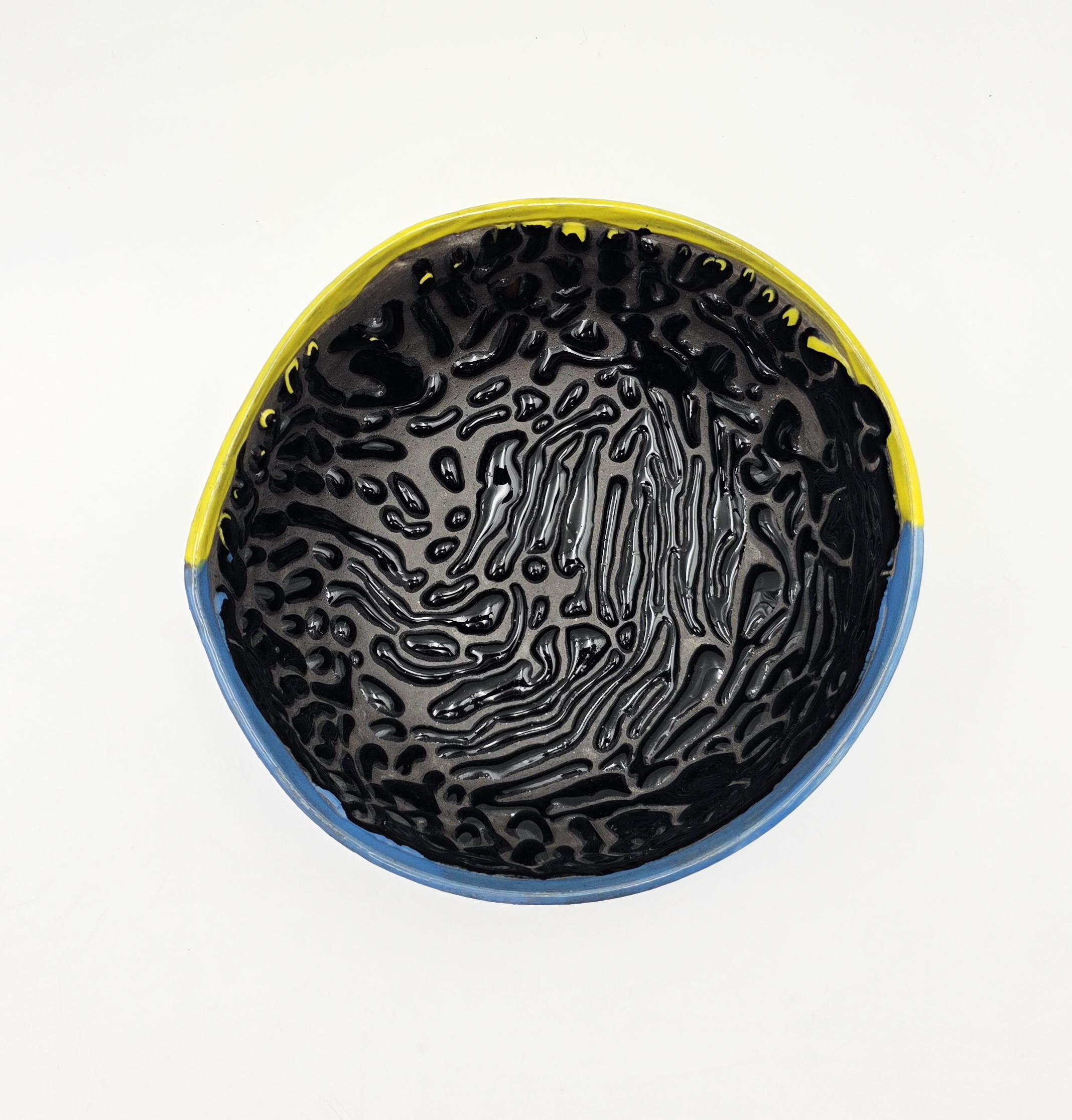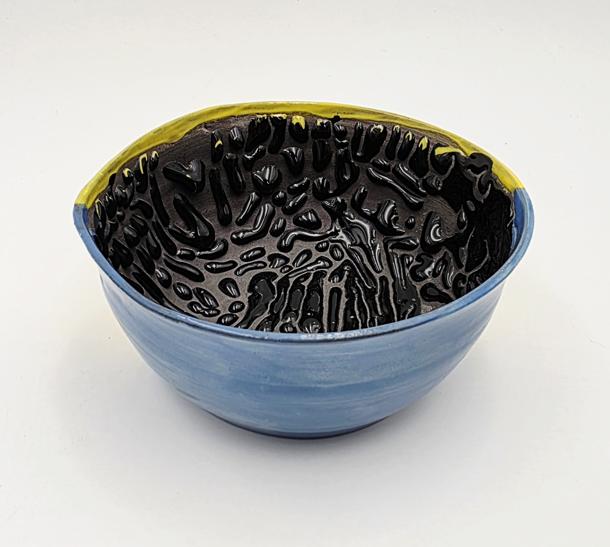 Piękna, pojemna miska w ergonomicznym kształcie. Z zewnątrz szkliwo jest niebieskie i żółte, a w środku na czarnym tle jest czarna smocza skóra – kropelki szkliwa, które pomagają w wyrobieniu piany do golenia. Miska posiada specjalny dzióbek do odłożenia pędzla.